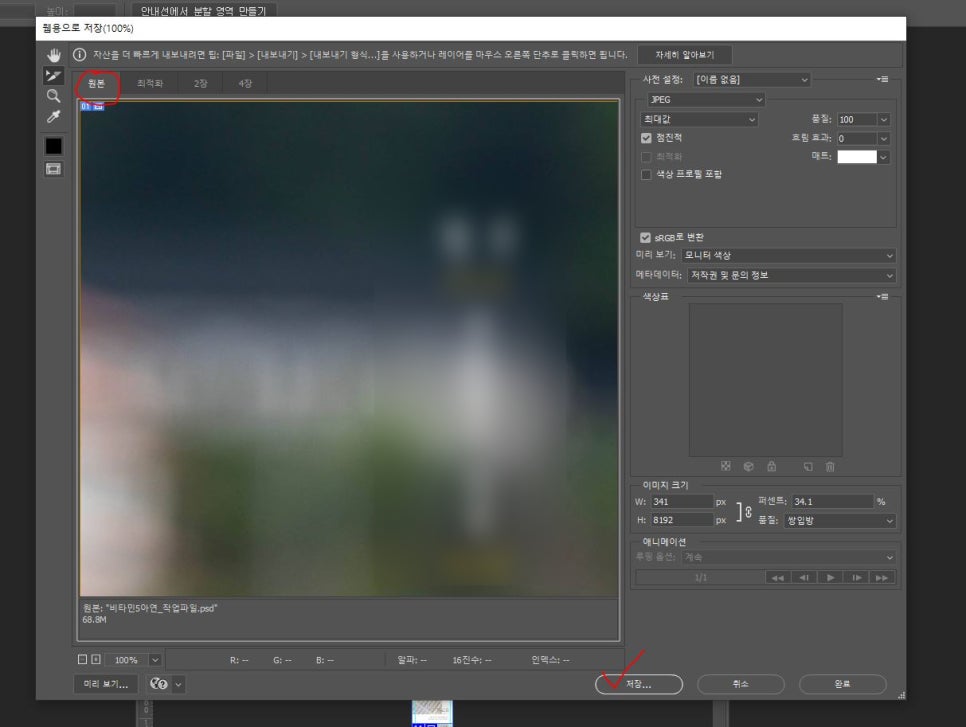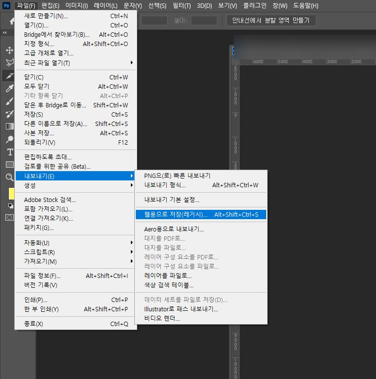 분할된 이미지를 확인 후, 파일 →내보내기 →웹용으로 저장을 선택